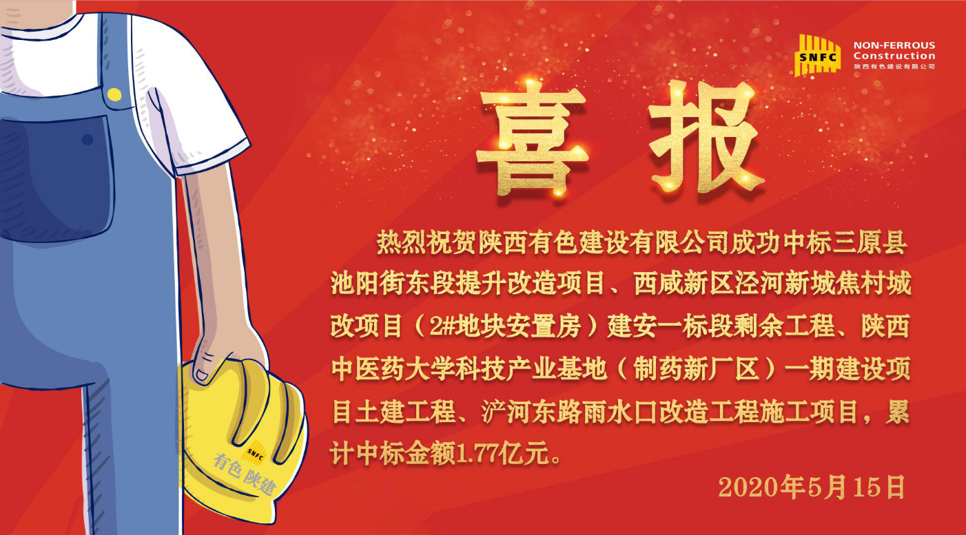 三原縣池陽街東段提升改造項目、西咸新區涇河新城焦村城改項目(2#地塊安置房)建安一標段剩余工程、陜西中醫藥大學科技產業基地(制藥新廠區)一期建設項目土建工程、浐河東路雨水口改造工程施工項目接連中標,累計中標金額1.77億元。